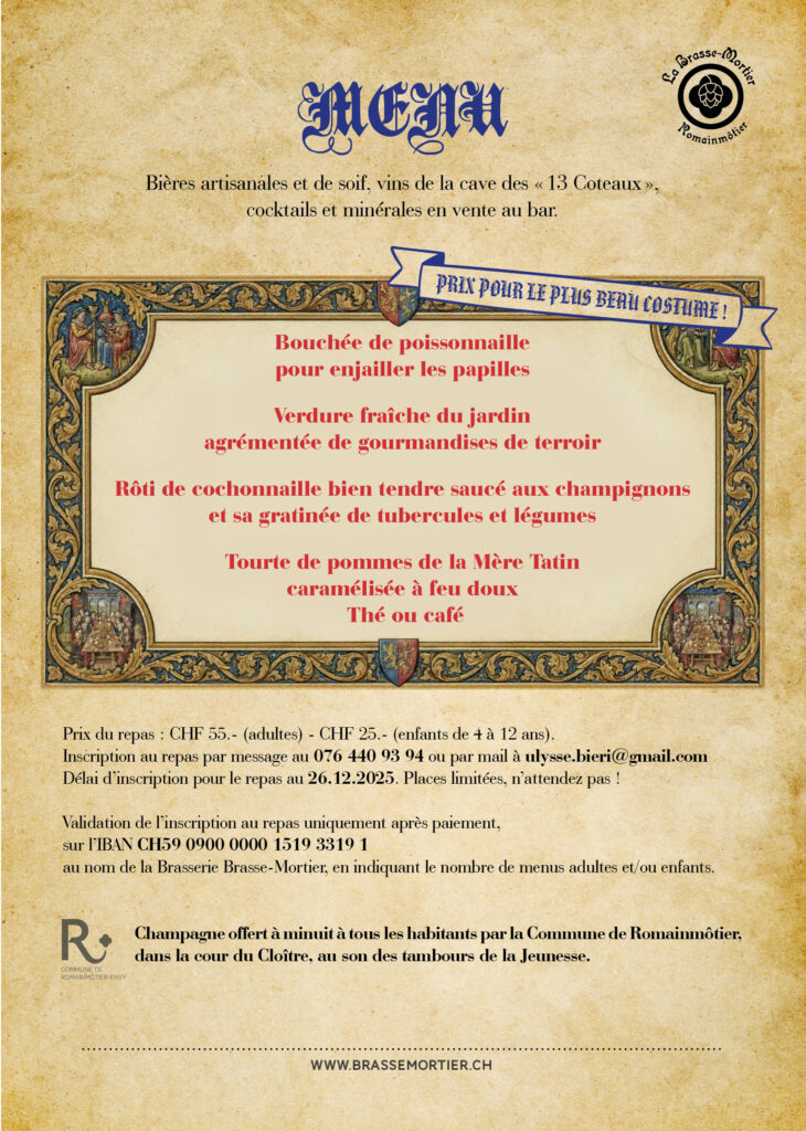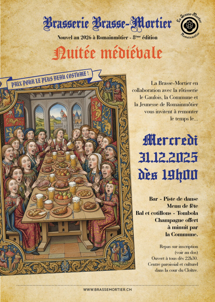 La Brasserie Brasse-Mortier a l’immense joie de vous convier à sa Nuitée médiévale du Nouvel An, laquelle se tiendra en la noble cité de Romainmôtier, le 31 décembre dès la septième heure du soir.