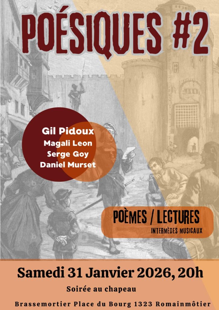Entre lectures et intermèdes musicaux, Poésiques #2 promet une soirée où l’on écoute, où l’on rit (parfois un peu jaune), où les mots grincent, caressent et surprennent — le tout sous le chapeau, à la Brasse-Mortier.